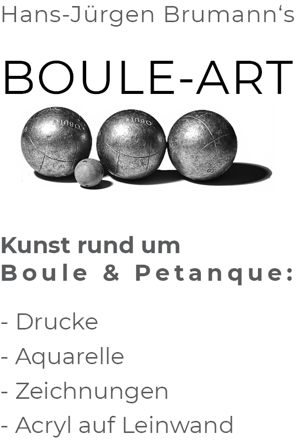 Jahrgang 1957, autodidaktischer Künstler seit den 1970ern. Seit 2017 widme ich mich wieder intensiver meiner Kunst. Motiv-Schwerpunkt: Boule & Pétanque – eine Leidenschaft auch als Spieler, die ich in über 500 Bildern eingefangen habe. Meine Werke entstehen als Aquarelle, Zeichnungen, auf Leinwand oder als Grafiken..